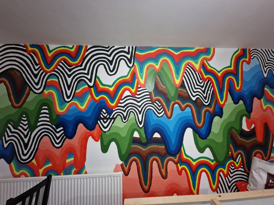 Inspired by the colourful work of Jen Stark, this mural is a project my partner and I worked on for around a week straight, in order to brighten our living space. This is the largest mural I have done to date, and I have thoroughly enjoyed the process and outcome.